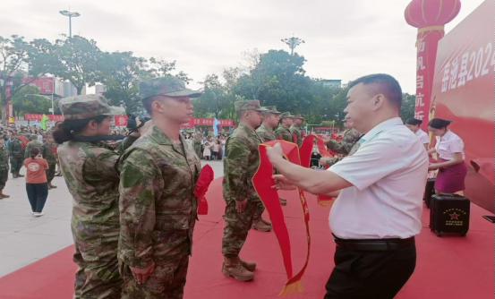 活动在雄壮的中华人民共和国国歌声中拉开序幕,激昂的旋律让在场的每一个人都心潮澎湃,感受到了作为中华儿女的自豪与骄傲。随后,县委常委、县人武部上校政治委员祝庆致辞,为新兵们佩戴上鲜艳的红花、绶带和送上纪念品,这些象征荣誉与使命的装饰,让他们的胸膛更加挺拔,眼神更加坚定。