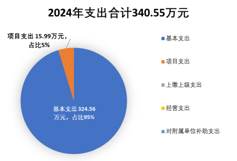 2024年度本年支出合计340.55万元,其中:基本支出324.56万元,占95.3%;项目支出15.99万元,占4.7%;上缴上级支出0万元,占0%;经营支出0万元,占0%;对附属单位补助支出0万元,占0%。