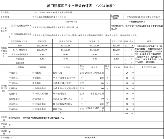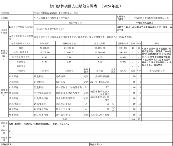组织对2024年度一般公共预算、政府性基金预算、国有资本经营预算、社会保险基金预算以及资本资产、债券资金、政府采购等全面开展绩效自评,形成了县委编办部门整体绩效自评报告、中文域名续费等预算项目绩效自评报告,其中,县委编办部门整体绩效自评得分为95分,行政管理体制改革工作项目自评得分为90分,机构编制三定项目自评得分为90分,事业单位登记换证项目自评得分为90分,中文域名项目自评得分85分。绩效自评报告详见附件。