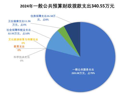 2024年度一般公共预算财政拨款支出340.55万元,主要用于以下方面:一般公共服务支出269.08万元,占79%;教育支出0万元,占0%;科学技术支出0万元,占0%;文化旅游体育与传媒支出0万元,占0%;社会保障和就业支出32.93万元,占10%;卫生健康支出11.96万元,占3%;住房保障支出26.58万元,占8%。