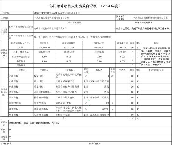 3.目标实现。(1)目标完成。2024年我办按照工作计划,按时完成了年度机构编制调整、年度事业单位登记、变更、换证、行政事业单位中文域名管理、行政管理体制改革及乡镇(街道)履职清单试点等工作任务。自评得分4分;(2)目标偏离。部门预算项目绩效目标数量指标实现程度与预期目标的无偏离。自评得分4分;(3)实现效果。年度部门预算项目绩效目标效益指标实施效果良好。自评得分3分