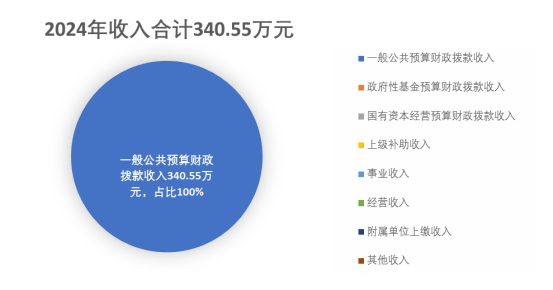 2024年度本年收入合计340.55万元,其中:一般公共预算财政拨款收入340.55万元,占100%;政府性基金预算财政拨款收入0万元,占0%;国有资本经营预算财政拨款收入0万元,占0%;上级补助收入0万元,占0%;事业收入0万元,占0%;经营收入0万元,占0%;附属单位上缴收入0万元,占0%;其他收入0万元,占0%。
