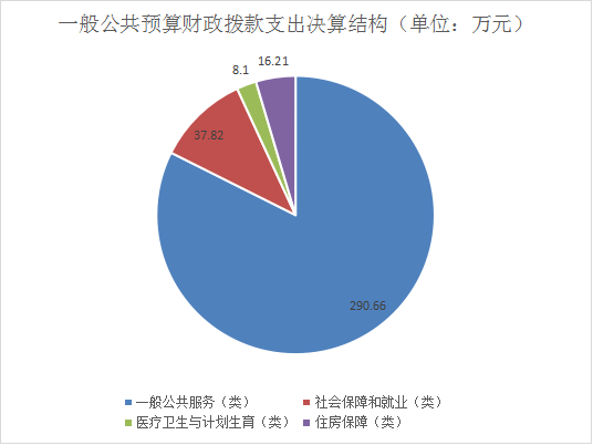 2019年一般公共预算财政拨款支出352.79万元,主要用于以下方面:一般公共服务(类)支出290.66万元,占82.39%;社会保障和就业(类)支出37.82万元,占10.72%;医疗卫生与计划生育(类)支出8.1万元,占2.3%;住房保障(类)支出16.21万元,占4.59%。