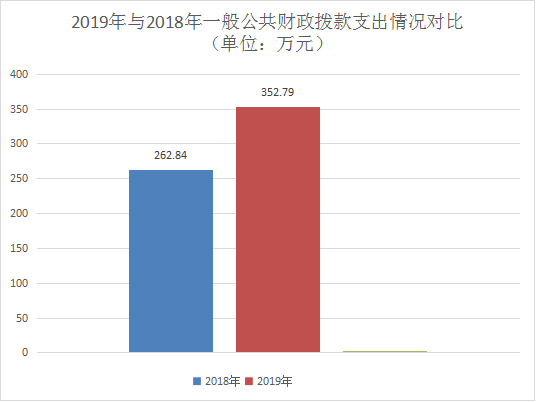 2019年一般公共预算财政拨款支出352.79万元,占本年支出合计的100%。与2018年相比,一般公共预算财政拨款增加89.95万元,增长34.22%。主要变动原因是业务需要,导致经费总额增加。