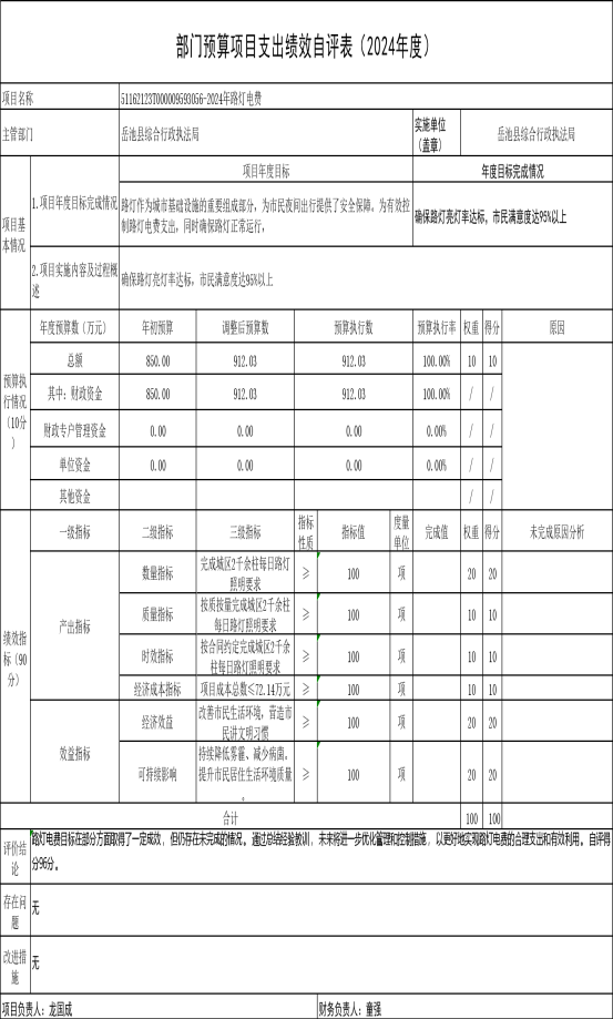 我部门严格按照年初预算进行部门整体支出,所有资金均已到位并按预算用途进行管理、使用,无截留、挪用等现象,完成了2024年部门整体支出绩效目标,群众满意率达96%以上。