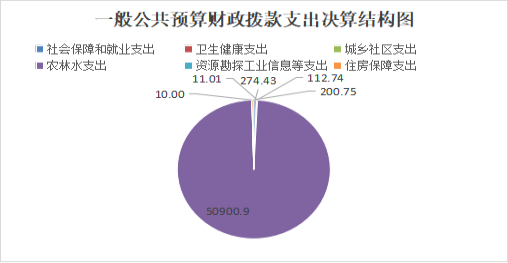2024年一般公共预算财政拨款支出51509.82万元,主要用于以下方面:社会保障和就业支出274.43万元,占0.53%;卫生健康支出112.74万元,占0.22%;城乡社区支出11.01万元,占0.02%;农林水支出50900.9万元,占98.82%;资源勘探工业信息等支出10万元,占0.02%;住房保障支出200.75万元,占0.39%。