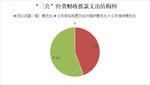 2024年“三公”经费财政拨款支出5.64万元,比2023年减少1.54万元,下降21.45%,主要原因是厉行节约。其中:因公出国(境)费支出决算0万元,占0%;公务用车购置及运行维护费支出决算2.5万元,占44.33%;公务接待费支出决算3.14万元,占55.67%。具体情况如下: