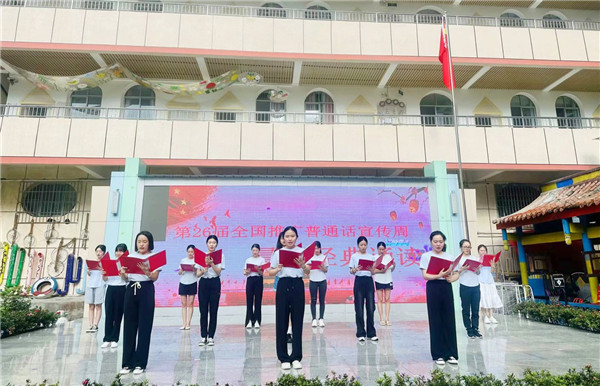 示范幼儿园从环境宣传入手,精心制作推普家园联系栏,通过电子显示屏发送宣传标语、口号,班级QQ群、微信群等方式向家长发出推广普通话倡议书。同时,组织孩子讲故事、唱儿歌、制作宣传画,组织教师开展“晨间经典诵读”“书写规范字”活动,把普通话渗透到师幼学习、生活的各个环节,营造了使用普通话的良好氛围。