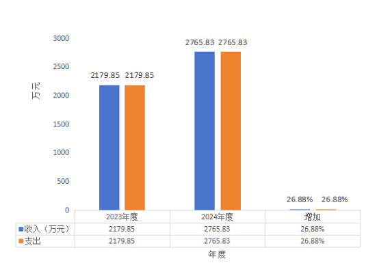 2024年度收、支总计均为2765.83万元。与2023年度相比,收、支总计各增加585.98万元,增长26.88%。主要变动原因是灾害防治及应急管理支出增加。