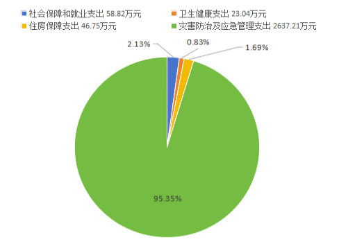 2024年度一般公共预算财政拨款支出2765.83万元,主要用于以下方面:社会保障和就业支出58.82万元,占2.13%;卫生健康支出23.04万元,占0.83%;住房保障支出46.75万元,占1.69%;灾害防治及应急管理支出2637.21万元,占95.35%。