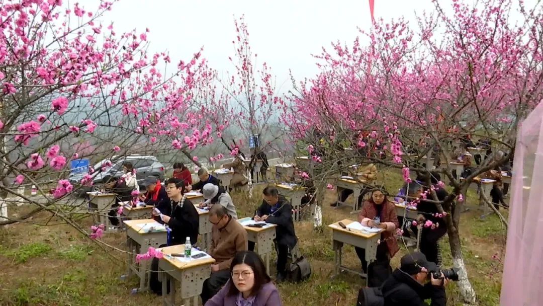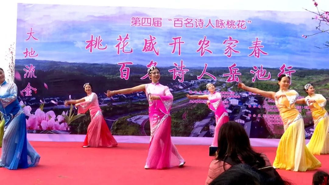 岳池县第四届“百名诗人咏桃花”文化活动在岳池农家生态文化旅游园区桃花岛举行来自川渝两地百余名诗人于桃林间即兴创作并登台咏诵以诗歌传递乡村振兴中的文化力量。