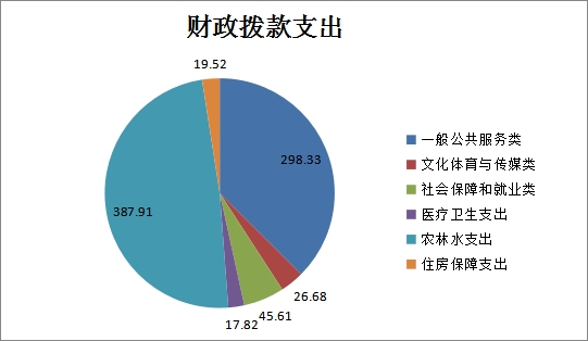 2019年一般公共预算财政拨款支出795.89万元,主要用于以下方面:一般公共服务(类)支出298.33万元,占37.48%;文化体育与传媒支出(类)支出26.65万元,占3.34%;社会保障和就业(类)支出45.61万元,占5.73%;医疗卫生支出17.82万元,占2.23%;住房保障支出19.52万元,占2.45%;农林水支出387.91万元,占48.73%。