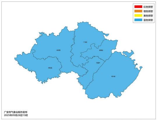 广安市气象台2025年09月28日15时51分发布暴雨蓝色预警:预计今天晚上到明天白天,我市有一次强降雨天气过程,武胜、岳池、广安区、华蓥、前锋区、邻水有大雨到暴雨(雨量30-70毫米),最大小时雨强30-40毫米,强降雨主要集中在明天凌晨到上午。过程中伴有雷电、短时强降水、阵性大风等强对流天气。